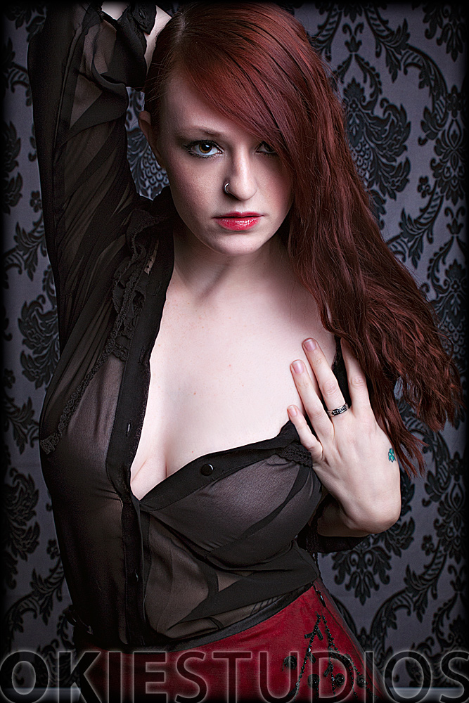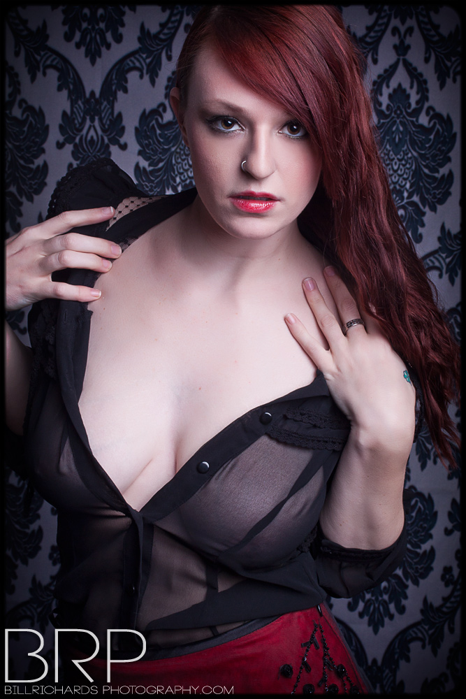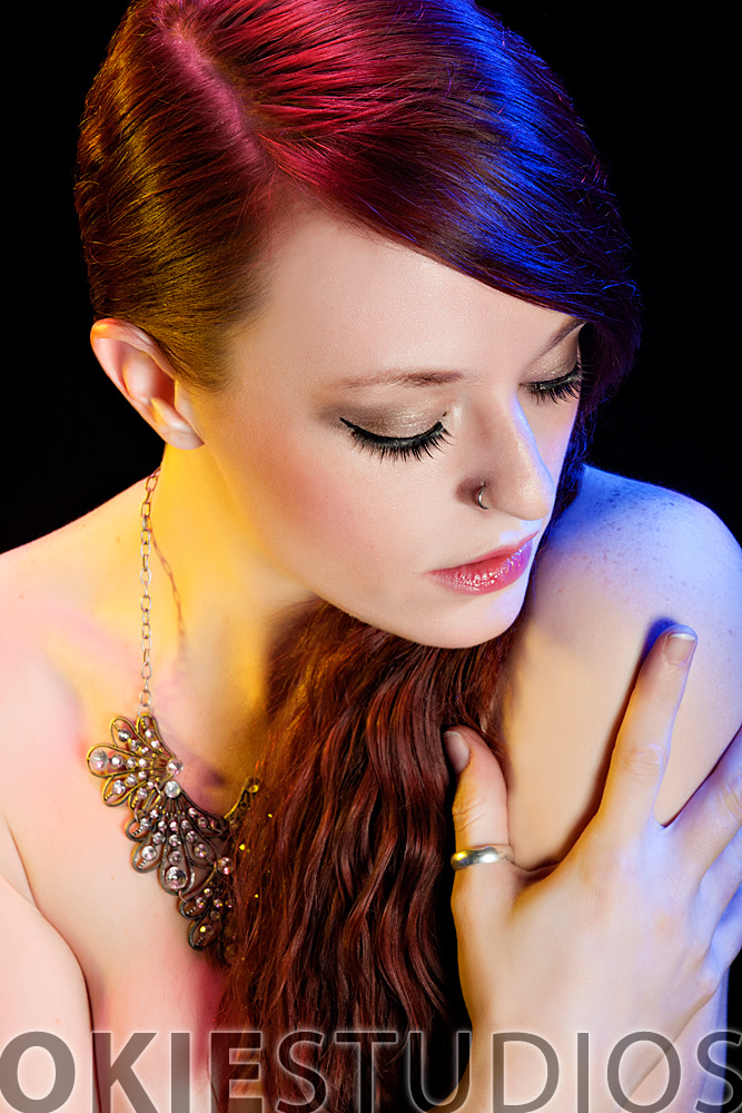 Lily Avery is a Tulsa Model , her specialty is fashion, But by all means she can kill of all other styles too. Here she is wearing a sexy dress with see thru fashion top for the colorful headshot I used 4 strobes. 3 strobes all have 20-10% grids and 3 colors, Yellow, Red, Blue to give. Some colors took more power to show up. Lots of trial and error, and a very patient model. Last light was a 28″ Mola Setti beauty dish, with strobe slightly from a up position.